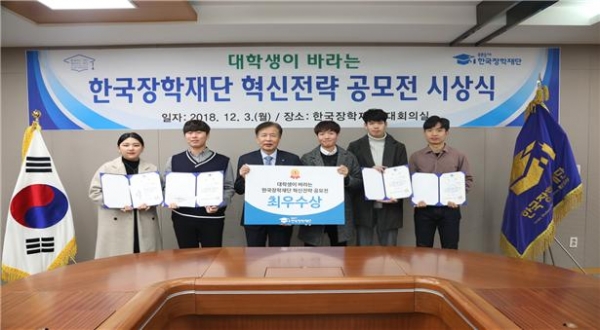 한국장학재단(이사장 이정우, 이하 ‘재단’)은 12월 3일(월) 대학생이 바라는 한국장학재단 혁신전략 공모전 수상작 6편을 선정하여, 한국장학재단 이사장 상장과 소정의 상금을 수여하였다.