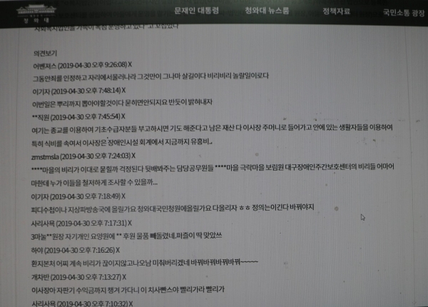 이사장은 비난하는 댓글은 "(요양시설내) 기초수급자들 남은 재산 다 이사장 주머니로 들어간다. 식비를 속여 이사장은 장애인 시설 회계에서 지금까지 유흥비로. 이사장은 자판기 수익금까지 챙겨간다. 설 추석 명절 때 함께 집에 쉬지도 못하는데 이사장은 아내 아들 마누라 손자까지 데리고 와 시설에서 특별상을 차려먹는다. 시설이 그들의 별장이나 직원은 종이냐. 서대구에 법인분소를 차려 아들을 원장 시키고 매월 사무실유지비로 빼돌린다" 등 다양하다.