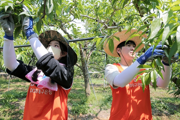 청도군 청도읍 소재 복숭아 과수 농가 지원을 위해 DGB대구은행 임직원으로 구성된 동행봉사단 및 대구은행대학생봉사단원 등 50여명이 힘을 모았으며, 봉사단들은 복숭아 나무 열매솎기 봉사활동으로 힘을 보탰다.