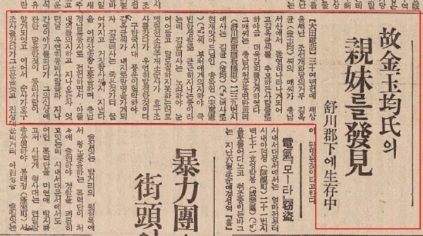 30여년 전에 세상을 떠난 개화당의 거두 김옥균씨의 매씨가 충남 서천에서 돌연히 나타나게 되어 고 김옥균씨를 추모하는 사람들로 하여금 더욱 감회를 깊게 하였다. 그 매씨는 충남 서천군 동면 판교리 237번지에 사는 김균 여사로 현재 맏아들 송돈헌(宋敦憲)씨 부처에게 의지하여 극빈한 생활로 근근히 지내는 중이라는데 김균 여사는 노쇠하여 눈이 어둡고 말도 잘 하지 못하는 터로 소관 주재소 순사가 호구조사를 갔다가 우연히 발견한 것이다.